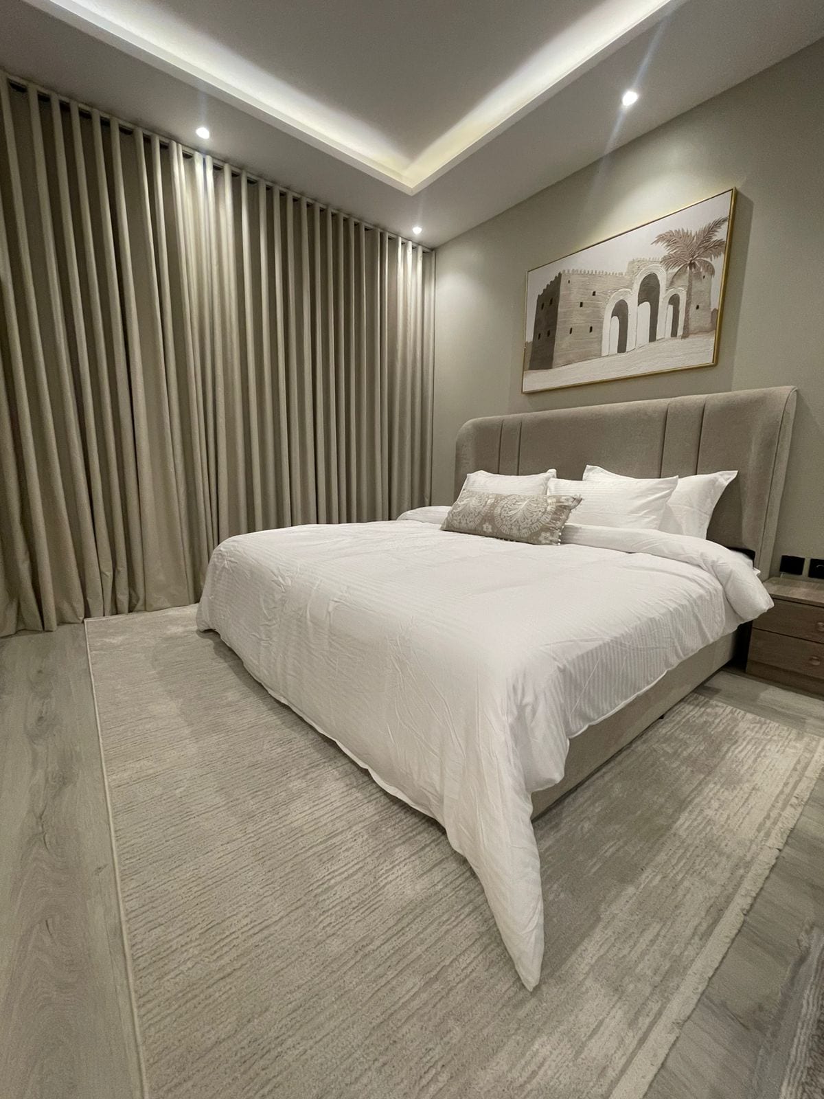 • Features a modern, comfortable design with hotel-style services: Self check-in + soundproofing + WiFi + orthopedic mattress • high-quality comfortable sofa + coffee corner with Brazilian coffee beans • bathroom with hotel amenities + fully equipped kitchen. • Prime Location • Centrally located near the Northern Ring Road • Close to: • Airport • Financial District • Riyadh Park, Nakheel Mall, and Granada Mall • Riyadh Season events and Boulevard • Daily cleaning is provided •