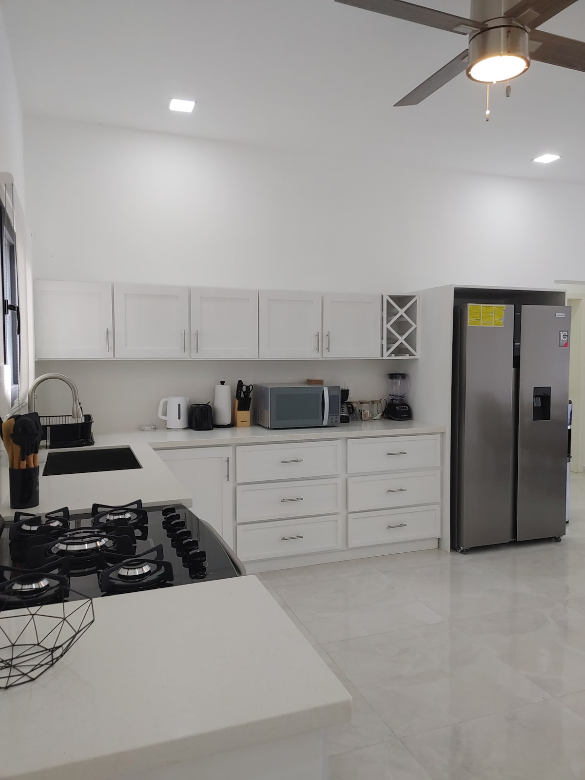 House with all the extras, cable TV, 3 bedrooms with private bathroom and A/C. 1 sofa bed in the living room, 1st floor 1 queen bed and 1 single, (2nd floor) 1st bedroom 1 queen bed and 1 full size bunk bed and 1 single, 1 inflatable bed, 2nd bedroom 1 queen bed for a total of 12 people. Wi-Fi. Vehicle rental option, private parking and for family sharing a relaxing pool awaits you!!! Sound system with integrated lights for your small family party.