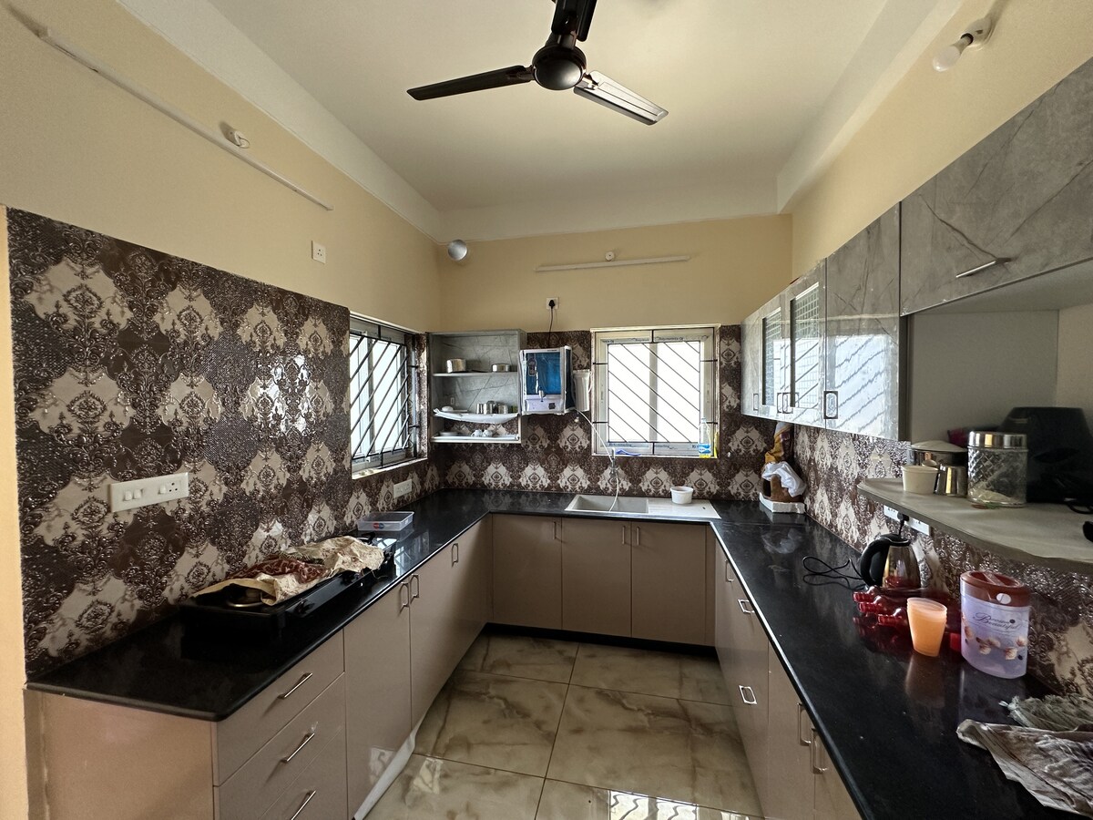 Completely Private with no sharing of any space, One Studio Room Small Apartment with a slab for kitchen & attached bathroom. New AC, cupboard, Queen bed with orthofoam mattress, ideal for two guests. kitchen area contains induction for cooking with utensils and cooking vessels. Hi-speed Internet connection for work from home Google TV with all Apps, AC, Fridge, Oven, Geyser, chairs, iron, etc, everything is there. Fully entilated place with 2 big windows. We need ID proof of all guests.