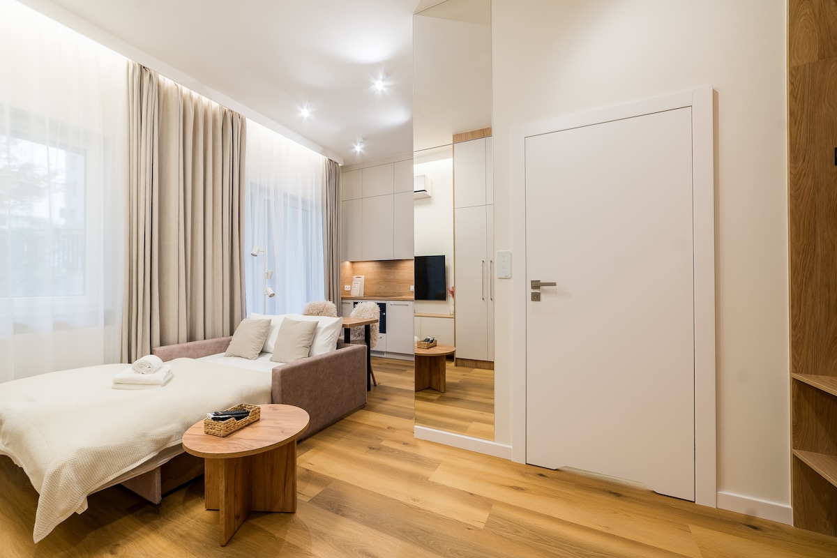 A new studio with a balcony and mezzanine in a revitalized tenement house in the city center, right next to the University of Arts. A few minutes to the Old Market Square. Good access by tram from the Main Station and the airport. There is an elevator in the building. The tenement house was a crime scene in Ryszard Ćwirlej's crime novel entitled You have it like in a bank.