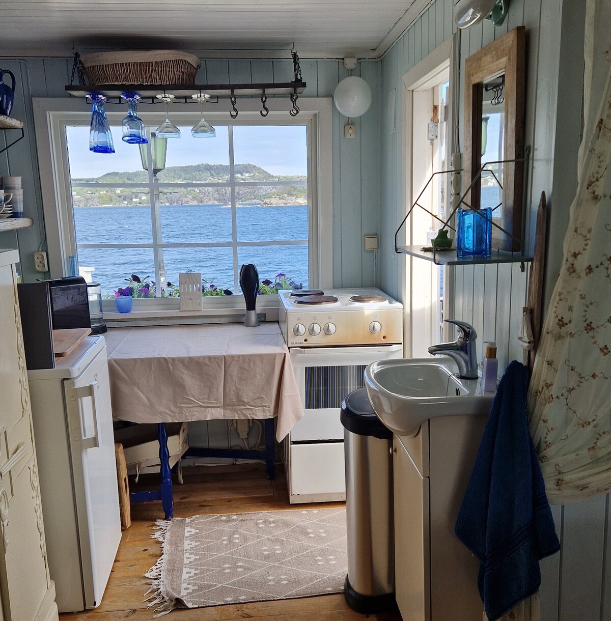Cozy cabin on a natural plot. Lovely view. The cabin has two small bedrooms with 4 beds, kitchen, living room with sofa and dining area. Bathroom with shower and toilet downstairs. From the terrace you can enjoy the morning and late evening sun. Kayak rental is agreed upon in advance. Walking distance to golf course, café, beach, frisbee course, fulger reserve, museum, grocery store, hiking areas. From parking about 70 meters to walk on a gravel path. The trail is a bit steep in places. From Bergen about 40 minutes by car, 1 hour+ by bus.