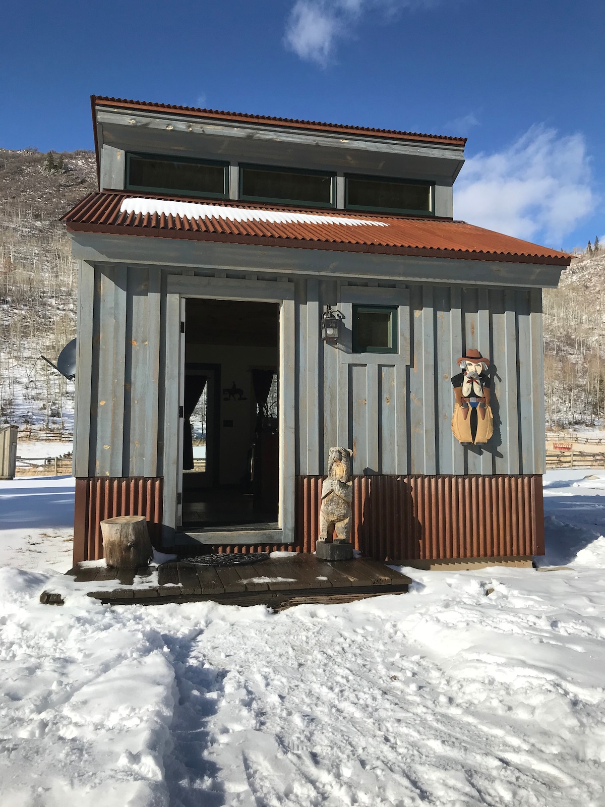 Yampa Blue Tiny Home is a cozy, modern 1 bedroom, 1 bath with high vaulted ceilings, natural light & a back patio looking out to the mountainside. This modern tiny home is perfect for a single or couple. It has a queen bed & dining area table. It is in close proximity to a community BBQ, yard games & campfire in the summer. This cabin has a small kitchenette for simple cooking. Feel free to bring your cooler, camp stove and a bag of ice. Kick back and keep it simple.