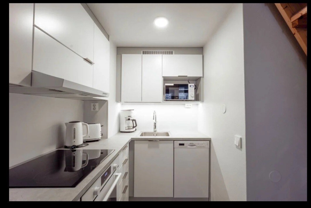 Renovated semi-detached house (2br, 67sqm) in a quiet location, 5 km from Ruka. 500 m to the cross-country skiing track, 100 m to the snowmobile trail, and 4 km to the grocery store. The apartment is great for families or a group of friends. The floor plan is such that the smaller bedroom and the separate toilet are separated from the rest of the apartment by a door, so privacy is available. A nice atmosphere is created by an open fireplace, sauna, a terrace, and a forest landscape as a bonus.