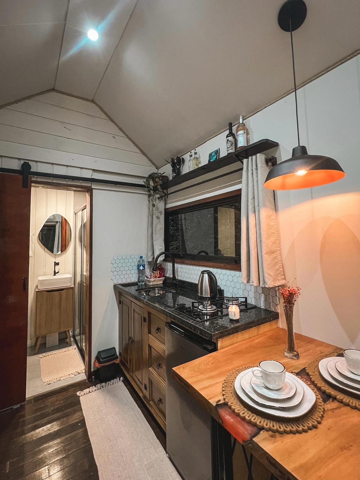 Uma trilha privativa leva até o canal, onde o pôr do sol é só de vocês dois. Auca e Jobs, nossos cães, adoram guiar os hóspedes até lá. 🐕 Cabana em meio à mata nativa, com ar puro de verdade. Namoradeira, redário e fogueira para noites que ninguém quer acabar. Ovos frescos do galinheiro e temperos da horta para cozinhar juntos. 🌿🔥 Praia do Ervino a 3 km. Cadeiras, guarda-sol, cooler e bikes inclusos. Para casais que querem desacelerar. 💛