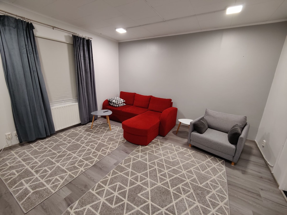 The beautifully renovated one bedroom apartment will serve you during your stay. The apartment has a sauna and a washing machine. The kitchen has just been renovated and is equipped with with modern equipment. The bedroom has twin beds and the living room has a double sofa bed. If necessary, a bed for a baby is also provided. The apartment has a beautiful décor and large windows to the evening sun. Welcome!