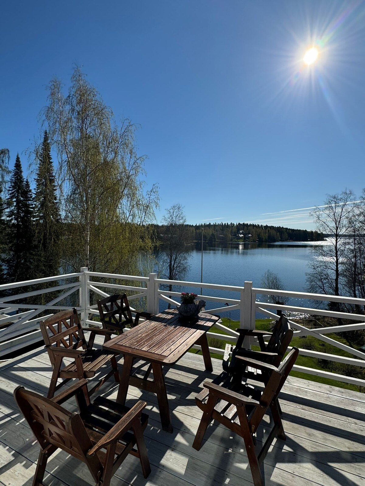 Cozy villa with a warm garage by the lake. The house is elegantly decorated and all modern appliances can be found. The house of just over 100 square meters is great for a family or a group of friends. A wood-heated sauna, two terraces, one of which is glazed, and a large yard with its own beach and pier guarantee comfort. A rowboat and kayak are also freely available.