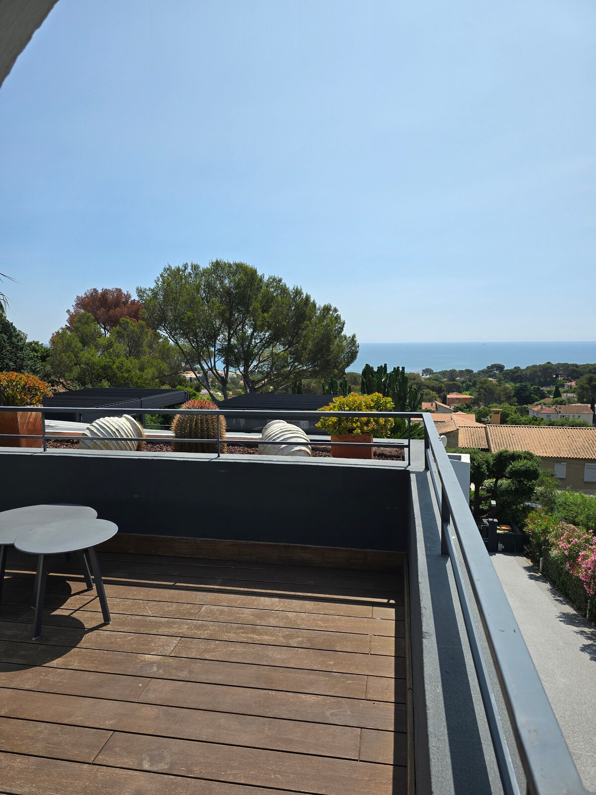 Large 26 m2 studio with 10 m2 west-facing roof terrace located on the top floor of a small secure residence of 7 apartments. Guests can enjoy a swimming pool, boules court and children's playground. The little extras: - private room with 2 bikes - a private parking space - Sandy beaches, coves, shops, restaurants, park and walks from 500 m - Tassimo coffee machine and pods - washing machine, dryer - Linen - End-of-stay cleaning