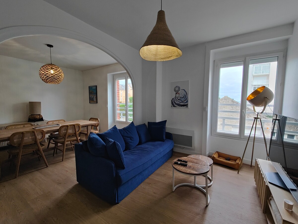 Chez Odette The ideal stopover in Saint Malo! This 4* apartment is spacious, comfortable, with smart decor. Its location is exceptional: in a luxury residence, close to shops, it is located on the beachfront which is accessed by a private passage You will appreciate its sea view thanks to its furnished balcony So that you don't worry about anything: bed linens, house, toilet and wifi are included in the service as well as private/secure parking