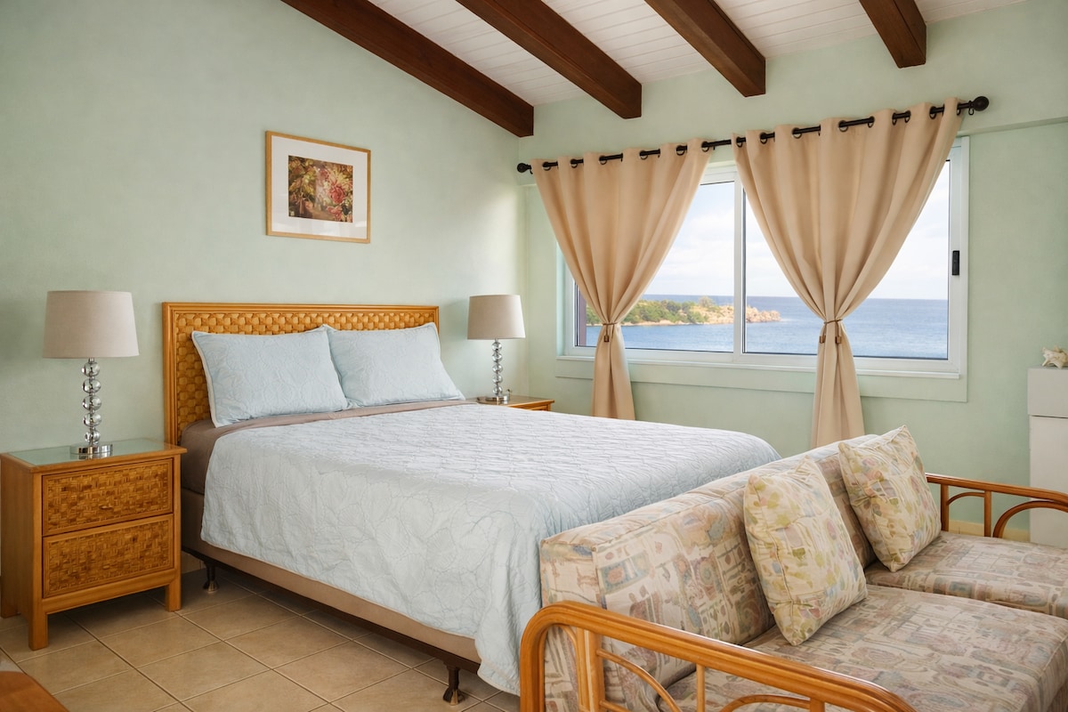 This secluded mountainside oasis, conveniently located mid-island, provides panoramic views of Salt River Bay, Buck Island and surrounding islands. A spacious studio with private veranda and separate entry off a verdant courtyard adorned with exotic flora, offers a stunning 180 degree ocean seascape. Enjoy beautifully landscaped grounds, Japanese gazebo and jacuzzi, while listening to the sounds of the breaking surf and cooled by constant trade winds. A perfect blend of romance and relaxation .