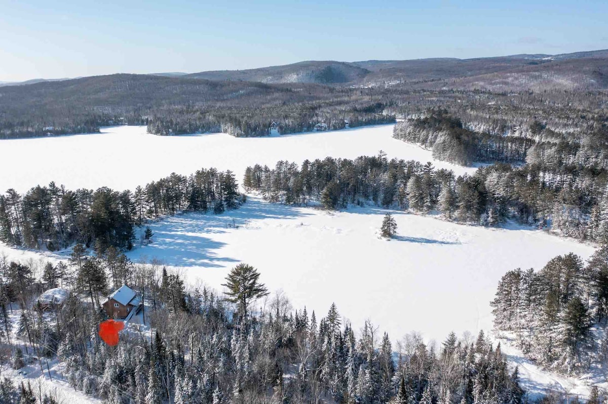 "Chalet Le Boisé" 1 hour from Montreal! Small chalet nestled in a wooded area, for 4-6 people. Experience the cocooning spirit with spa, clawfoot tub and indoor/outdoor fireplaces. Stunning views of the lake. High-speed wifi connection to combine work and relaxation. Perfect for families, couples and teleworkers looking for an escape. Your haven of peace awaits you! Note: Lake view, no lake access. Please respect the neighborhood 🙂