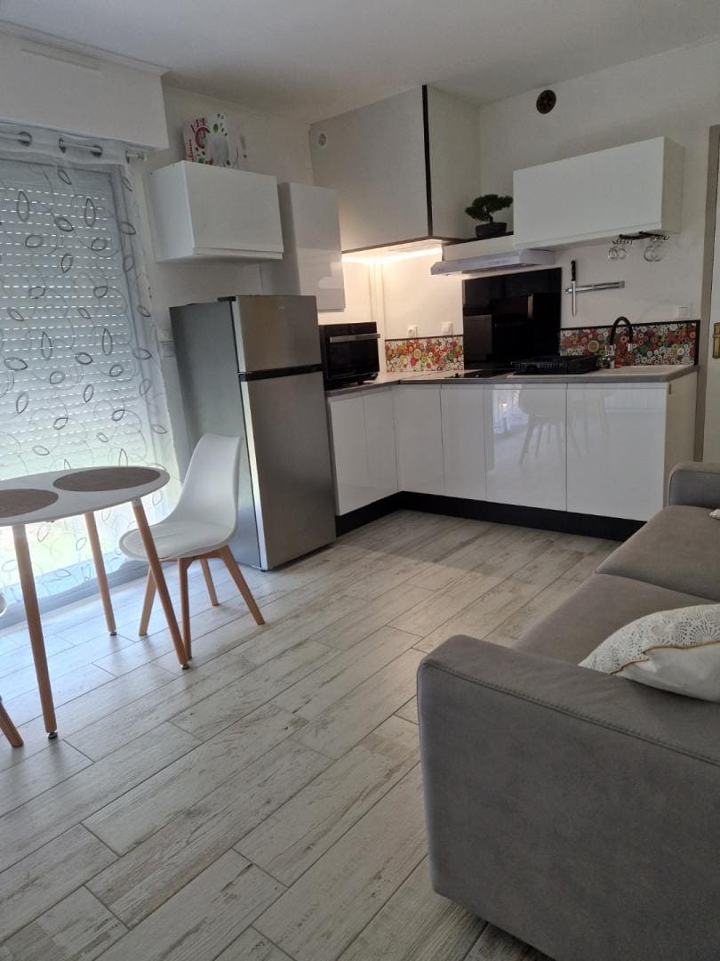 Charming fully furnished studio apartment ideally located in Royan. Featuring a private parking space, this studio offers optimal comfort for a person or couple. Modern and quality furniture for a welcoming interior with equipped kitchen (pod coffee maker, toaster, microwave oven, washing machine). Bed and bath linens provided.