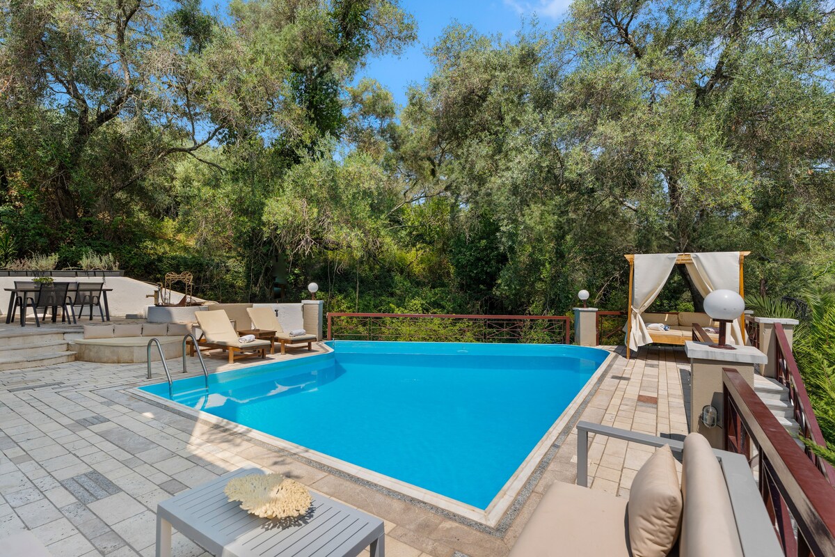 A luxury rustic Villa on the west coast of Corfu Island, overlooking the Ionian Sea, just 17km from Corfu town. The Villa sits in a very private location, with Dehoumeni Beach just below the villa, reachable by footpath and long sandy beach of Agios Gordis just 5 minutes by car. A full renovation has recently been completed and the villa now has a bright modern décor with rustic finishes in stone and wood.