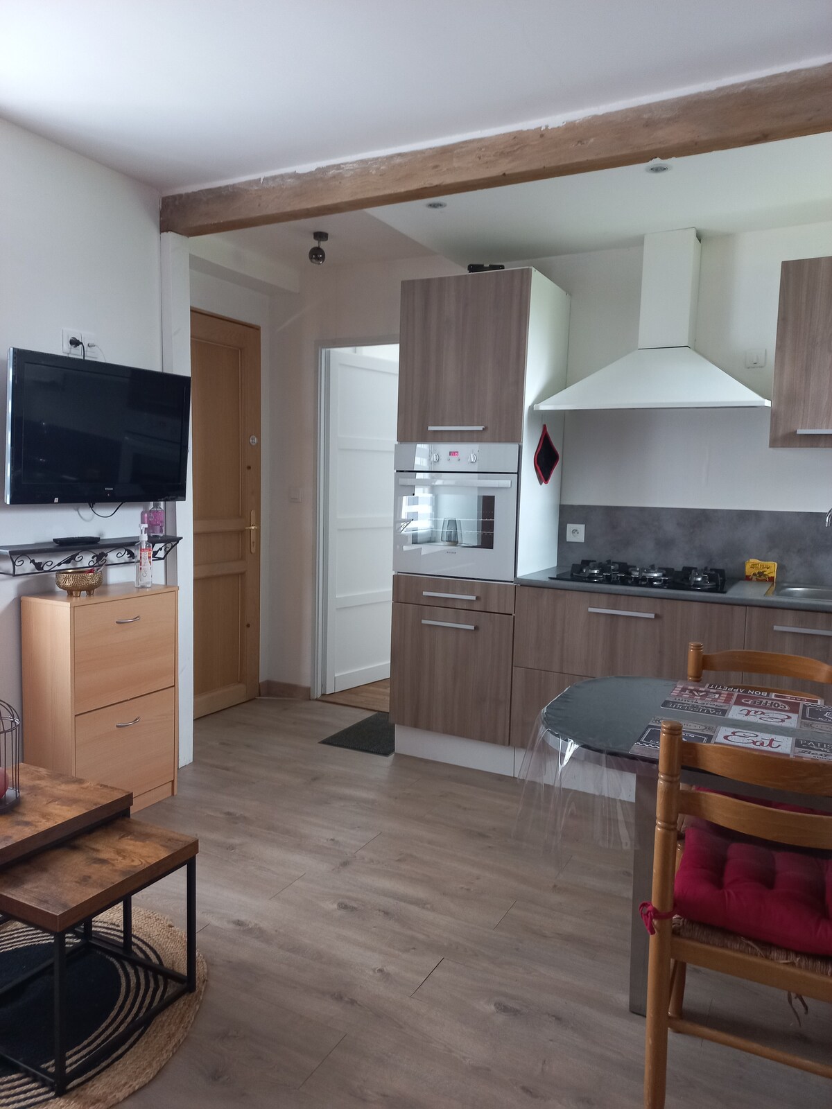 Accommodation includes: - a living room with equipped kitchen (fridge, stove, microwave, Nespresso), dining area, TV and 160 convertible sofa. - one bedroom with double bed 160 - bathroom with shower and toilet Quiet environment, terrace with furniture, private parking. Self check-in. Shops nearby: supermarket, bakery, bar-tobacconist, etc. Close to exit 24 Parigné l'évèque of the A28. Close to 24 Hours of Le Mans circuit, and karting