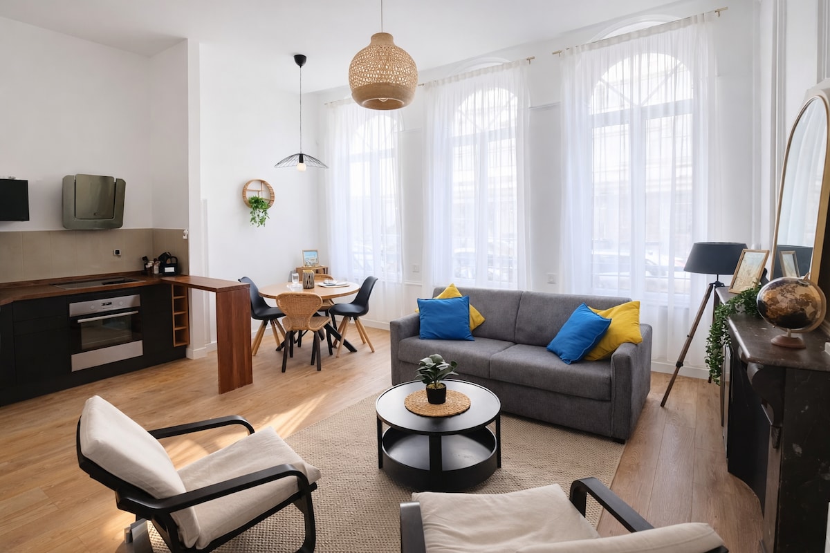 Relax in this carefully and tastefully decorated apartment. Located in the heart of the old town of Boulogne-sur-Mer, a stone's throw from the Cathedral and the castle-museum, this bright accommodation offers a beautiful view of the cathedral. Located on the first floor of a secure residence with gate and digicode. Close to restaurants, bars and shops, it is ideal for a successful stay. Enjoy the sea air of the Opal Coast, its beaches and Nausicaá, the largest aquarium in Europe.