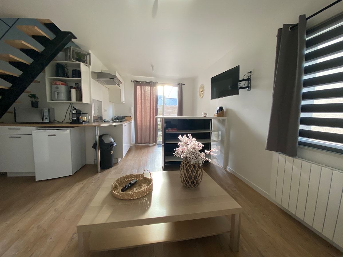 We welcome you, on the first floor of a luxury house, in a 25 m² furnished studio, completely independent, a few minutes from the historic center of Dinan, and a 2-minute walk from the Les Alleux business center, located in a very quiet area. Independent entrance, equipped kitchenette, plus kettle, Senseo coffee machine, toaster, separate shower room and toilet. 20 minutes from Saint Malo and the beaches (Saint-Briac-sur-Mer, Saint-Lunaire-sur-Mer), and 40 minutes from Mont-Saint-Michel