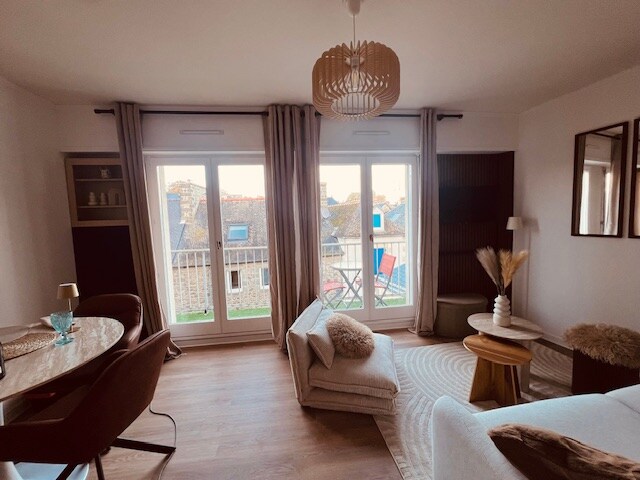 Large bright 30 m2 studio in the heart of the Saint-Quay-Portrieux harbor district. Comfortable, refurbished with large sunny balcony. Sleeping area separated from the living room area. Fully equipped kitchen area (washing machine, dishwasher, oven, microwave). Bathroom with shower. Separate toilet. Located 100 m from the beach and many shops. Private closed parking.