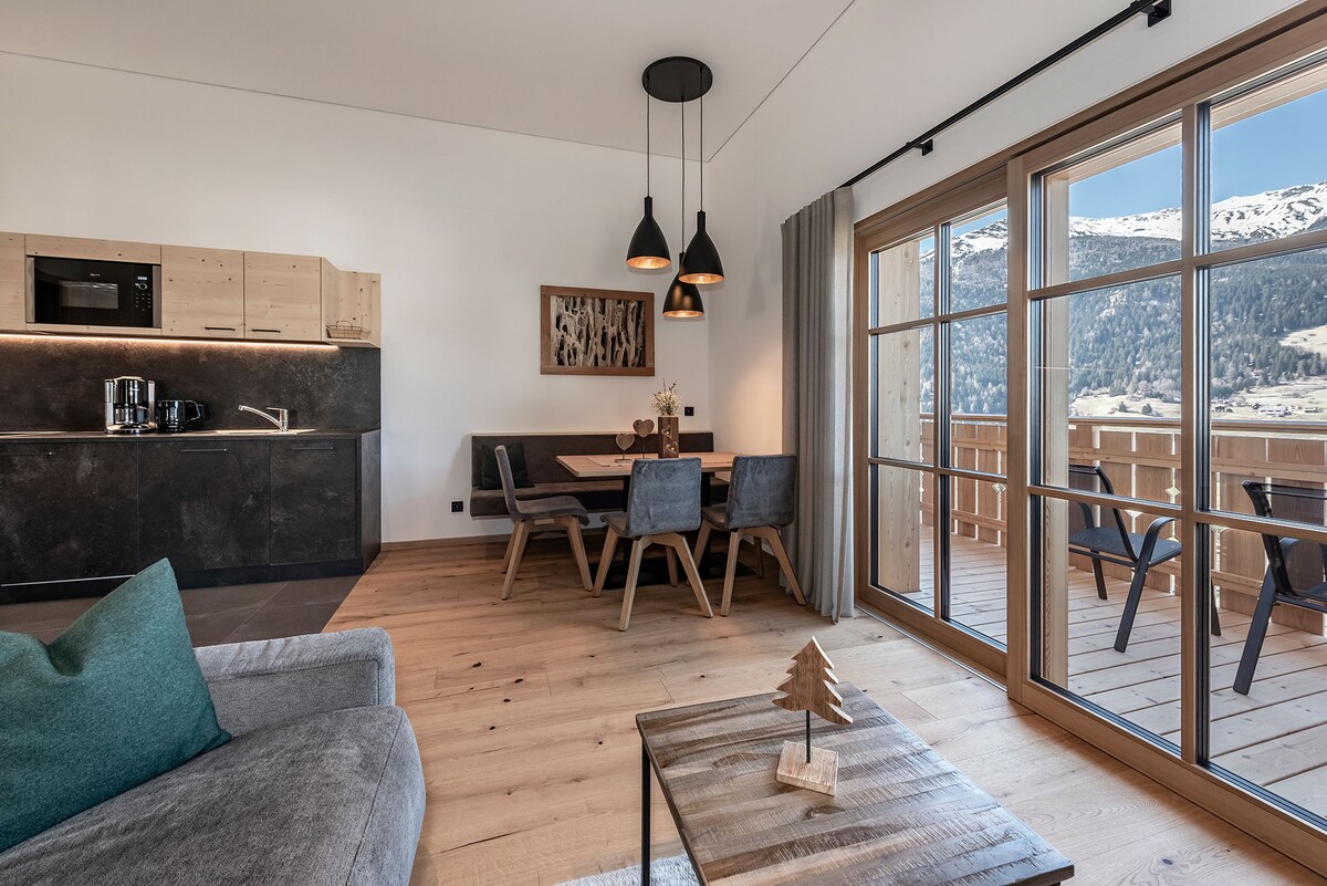 Elegant penthouse apartment in modern alpine style on the Seefelder plateau. The cozy, quiet apartment on the last floor is designed for up to 4 people very comfortably. It has a bright living-dining area with modern fully equipped kitchen, two double bedrooms, two bathrooms, underfloor heating, free Wi-Fi and a very large private terrace. From there you can enjoy the breathtaking view of the mountains and the Inn Valley, both in summer and in winter.