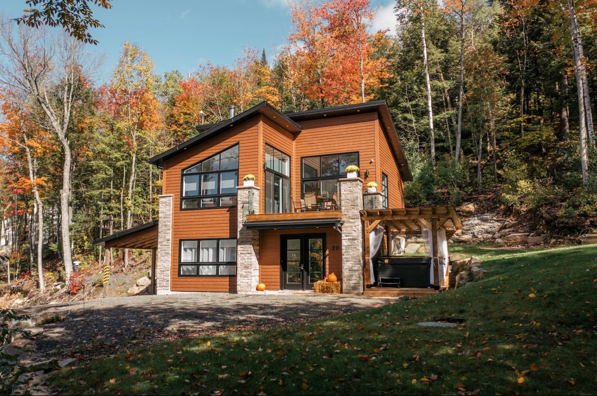 Our Nordic forest chalet is perfect for spending quality time as a couple (or with a kid), or for a work-retreat (with high-speed WiFi). The wooden interior is warm and cozy. The full-height windows offer stunning views over a forested valley. The open-concept kitchen and living room keep you in the conversation while cooking. If you prefer to cook outside, there is a fire pit with a grill and outdoor dining table. Only 70-min drive from Montreal. The lake is a 25-min walk if you park nearby.