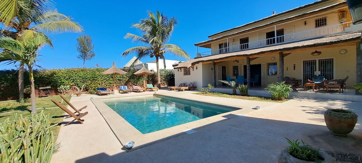 Villa located on Senegal's renowned small coast, between Ngaparou and Nianing, on a large sandy beach, with the pirogues of the relaxing fishing village of MBaling nearby. Far from the mass tourism of Saly, 10km away, our large family home welcomes you when we're not there, with a superb ocean view, private swimming pool and large terrace equipped for your comfort. The house was completely renovated in January 2025 to a very high standard.