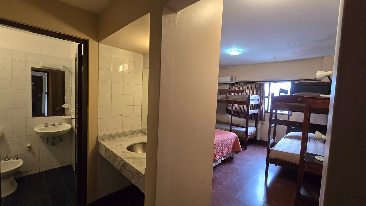 Rooms in the heart of Salta, close to all tourist spots. The quadruple room has a double bed and two single beds, with a private bathroom, flat-screen TV, air conditioning, heating, Wi-Fi, bedding included, and a common room with tables and armchairs. Personalized service.