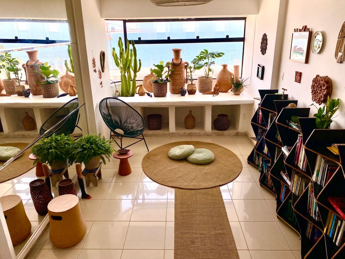 This is our home. A penthouse in Rio Vermelho, in front of Paciência Beach. Inspired by the reading of Jorge Amado, by the endless horizon of the ocean where the whole house has a view of the sea, by the culture and handicrafts of the Northeast that decorate the space. We also have the privilege of watching the sunset while taking a shower and a pool bath indoors.