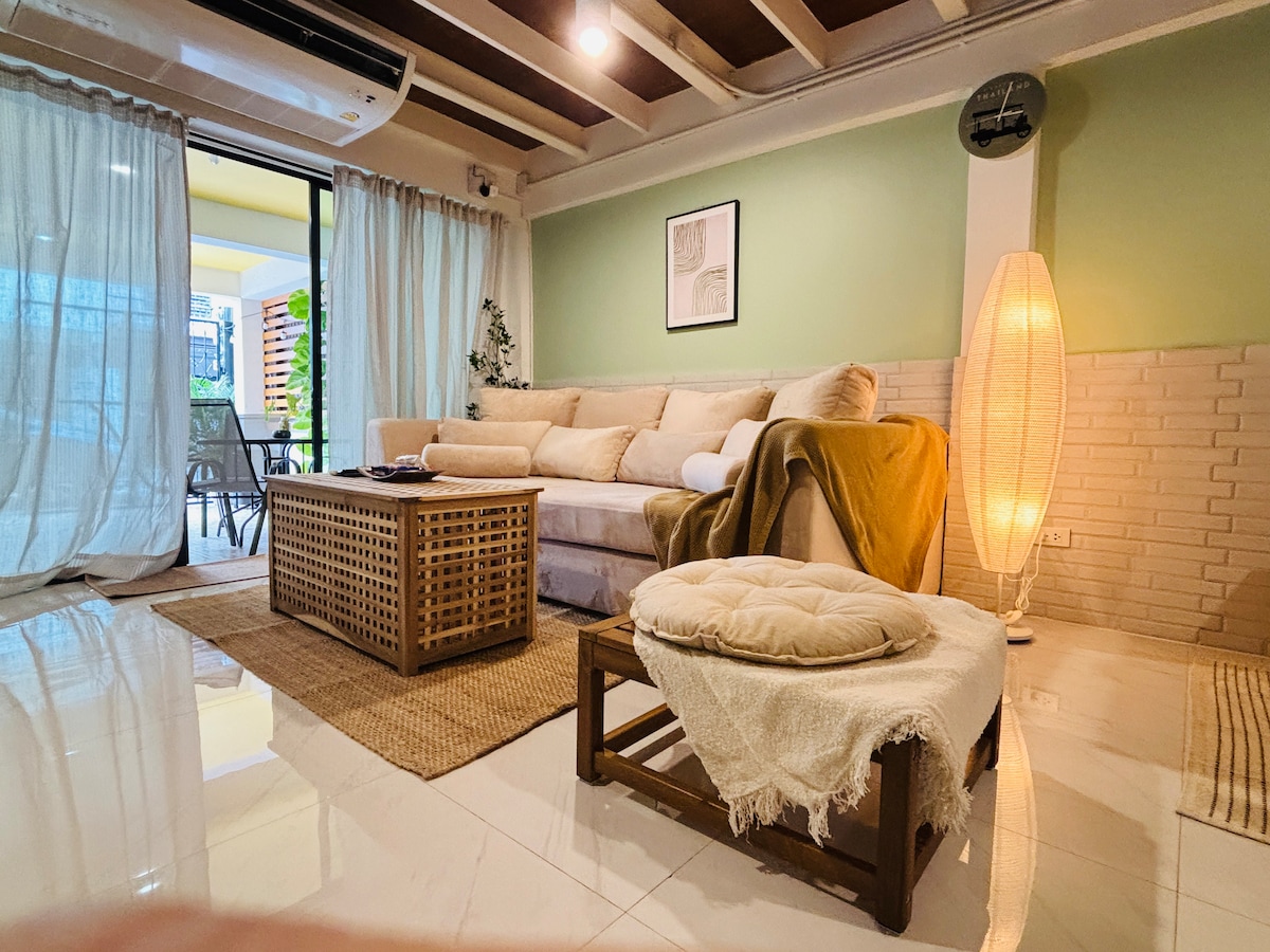 Welcome to The Forest Duplex Retreat – a relaxing nature escape in a quiet green setting. 🍀 The duplex features a bright, high-ceiling living area that feels open and airy. Large glass windows invite natural light and greenery into the space, creating a seamless connection between indoor comfort and outdoor serenity. Imagine wake up to birdsong and soft light filtering through the trees, relax on the soft sofa, work by the window with forest views, or simply enjoy stream your favorite shows.