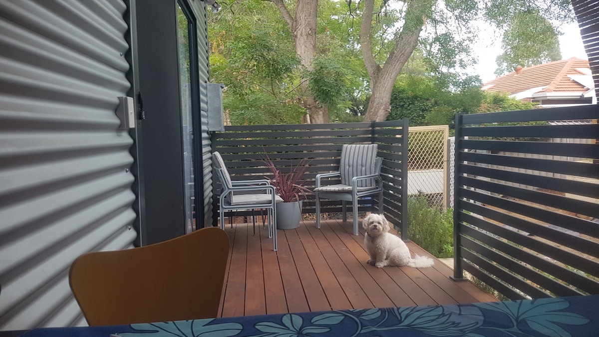 Funky, tiny house, with everything you need for a tiny stay. A super comfy daybed that converts to a kingbed on the ground floor & a double bed on mezzanine level Extra large shower Beautifully decorated & appointed. Close to Freo, on bus line or $8 Uber ride, & close to river & beach. Outside area, with laundry sink & washing machine Can sleep 4 , perfect after a night in Freo but for longer stays recommend only 2 people. Steps to mezzanine bed are vertical so not for everybody