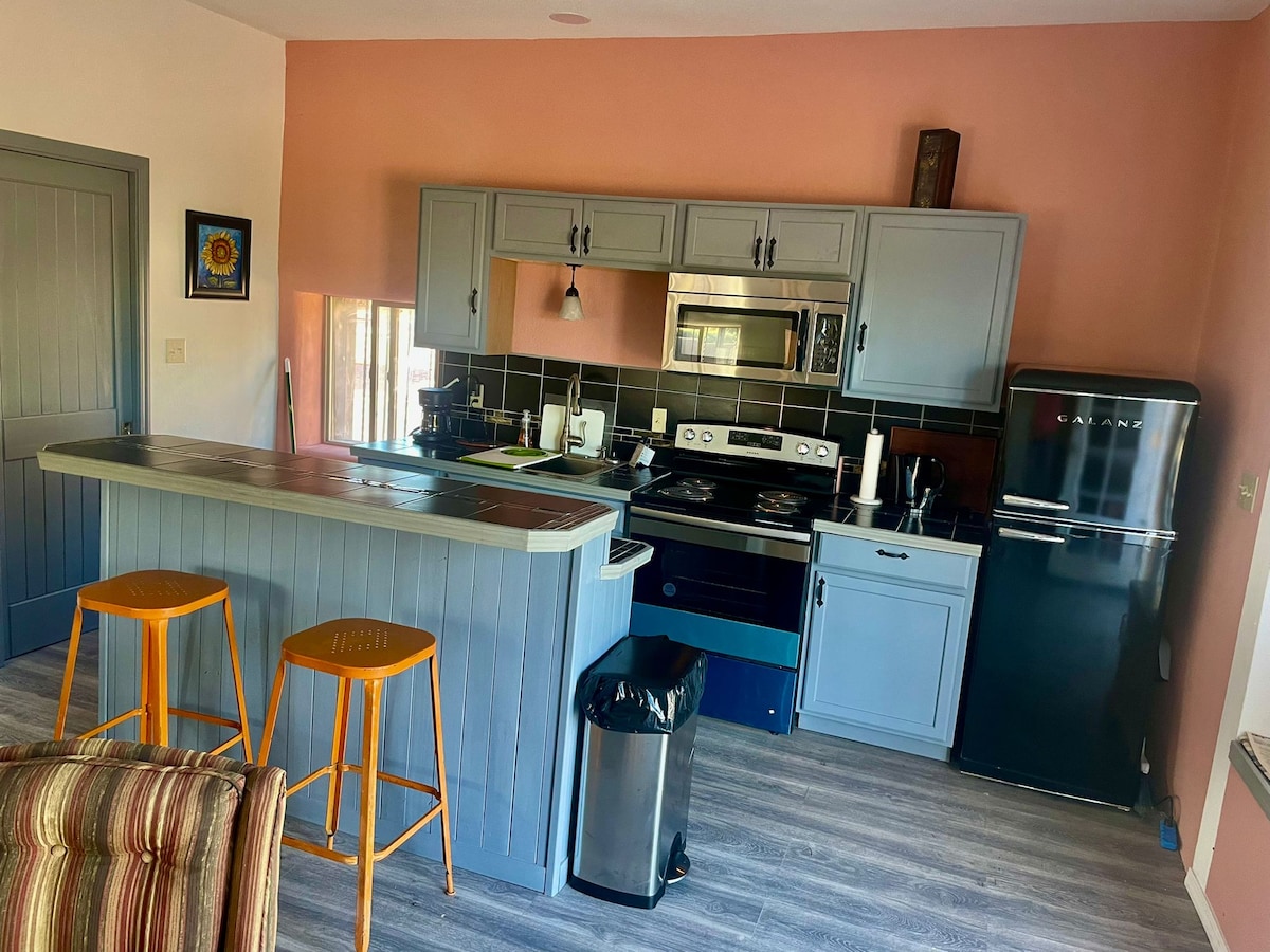 Private guest house with steam sauna nestled in 40 acres of hike-able land. Find tranquility in New Mexico's high desert. Common areas include huge sun room and an outdoor adobe fire ring. Birdwatcher's paradise! The Casita has a mini fridge, microwave, and coffee pot, tea kettle, silverware, plates and glasses. Coffee and tea are provided. Please note check in time is between 3pm and 8pm.