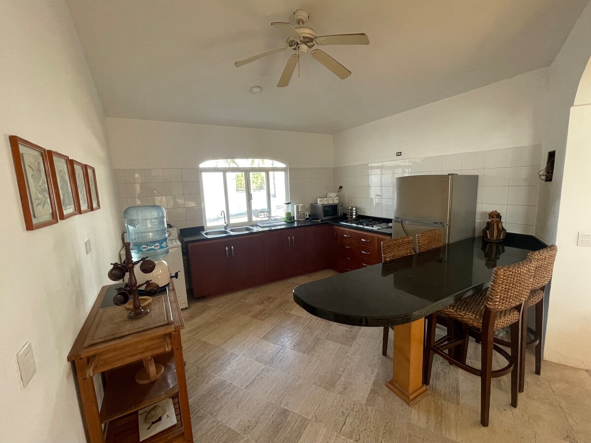 House located at the foot of the beach, with 8 villas (apartments), each with two rooms with air conditioning and a closet, a full bathroom with hot water, a kitchenette with a minibar and stove, a living room with cable TV, Wi-Fi, shared areas such as a terrace, an infinity pool with a bar, green spaces, and parking.