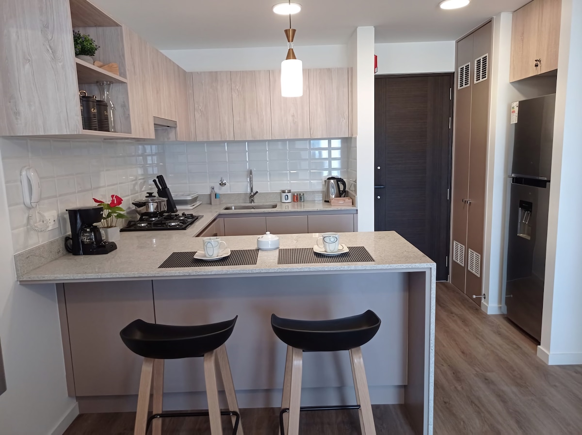 Exclusive apartment in a nice area of San Isidro, located next to the Real Business Center and the Hyatt hotel. It is a brand new building with 24-hour security. It has a bedroom, queen bed, cotton bedding, ensuite bathroom and smart TV. Fully equipped kitchen, living room with smart TV overlooking the dome of the Virgen del Pilar Church, desk to work. The location is ideal surrounded by the best restaurants in San Isidro.