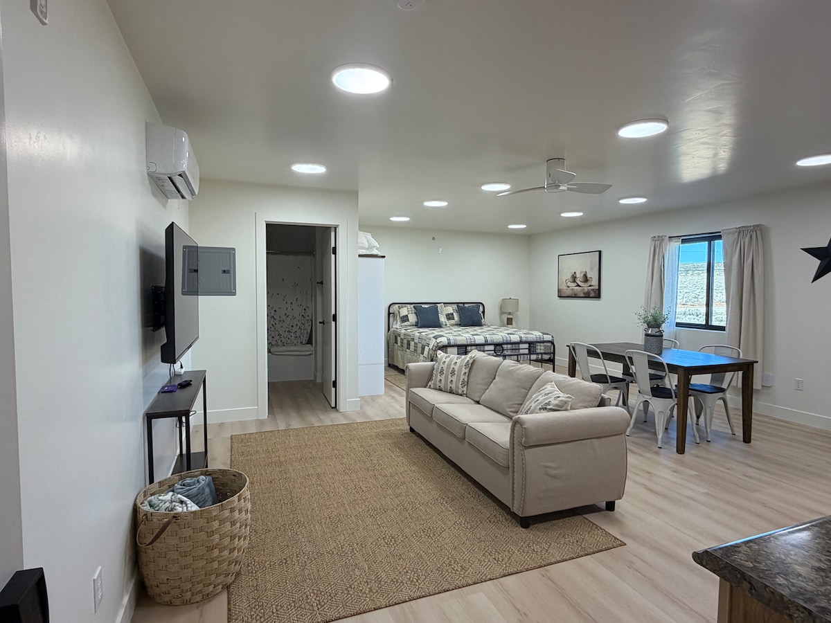 Inviting two bedroom bungalow with unique, private, and spacious outdoor space. New, comfortable beds, wood burning stove, artisan hand-made furniture. New heating and AC system. Two dedicated work spaces and 1G fiber internet for remote work! The most shade and privacy you'll find in town. Help yourself to the fruit trees, enjoy the stars and mural of Factory Butte from a hammock, fire up the grill for some patio dining and take a selfie in the #DirtyDevilSaloon