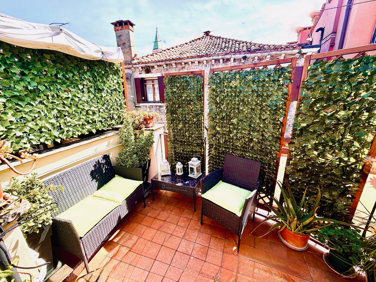Spacious and modern apartment, 80 sqm, on the 3rd & 4th flr. Private panoramic rooftop terrace with table, chairs, sofa. Free wi-fi, conditioned air, dishwasher. Very central, between Rialto Bridge and Saint Mark Square. Historical building (no lift) ideal to visit Venice walking. 1 dbl room and 1 sgl room. Check-in: 3 pm to 8 pm. Check-out within 11 am. Tourist tax 4 € p.p./ p.d. to be paid cash locally. Breakfast à la carte is available at our Bar, located at a few steps from the apartment.