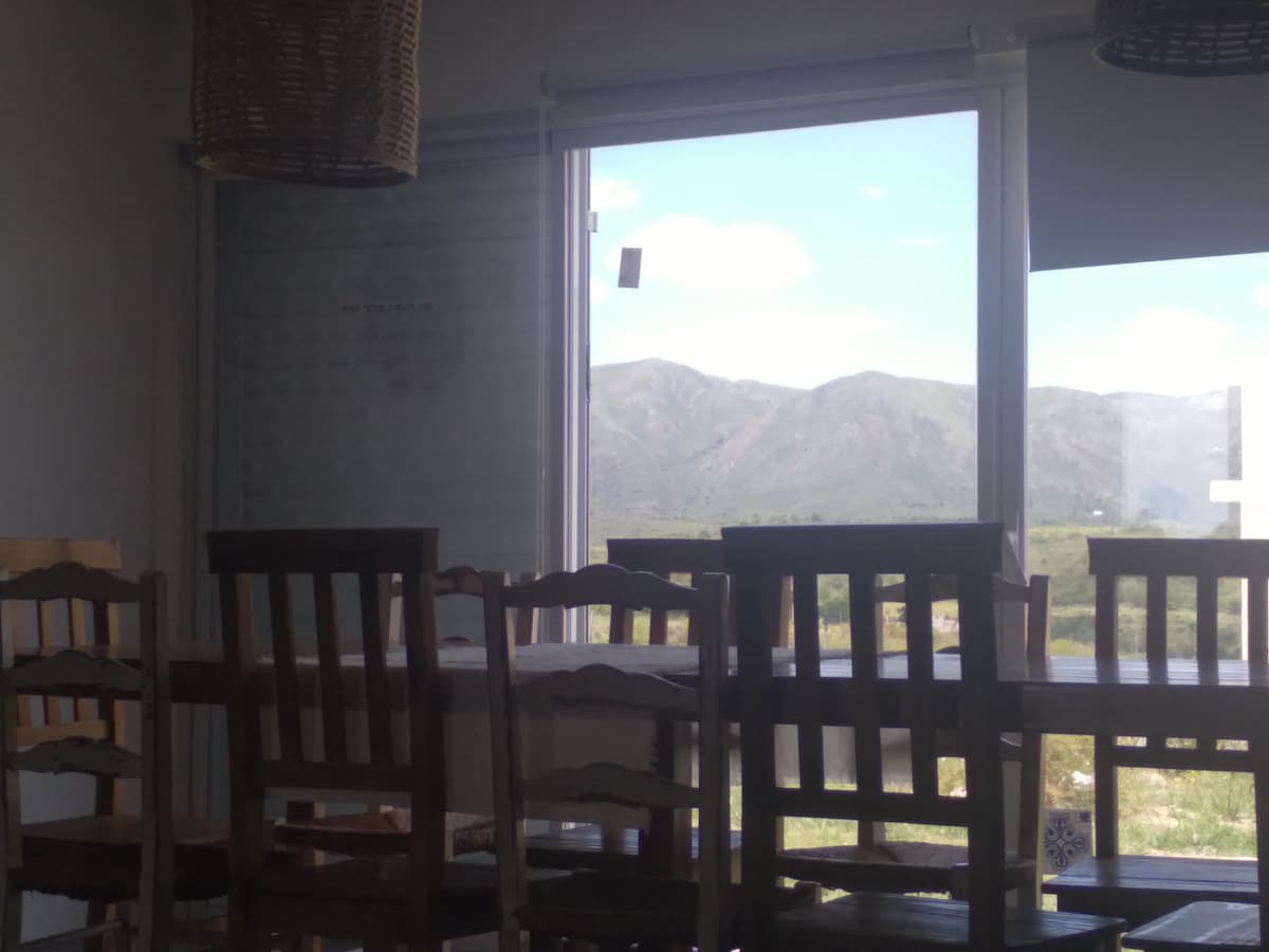 A great 200m2 mansion, just 2 km from Cerro Uritorco, has a 2000m2 garden and a swimming pool with a water filter. It is located on a hill, which allows a view of Cerro Uritorco, unique in Capilla del Monte. Inside it has all the comforts, from a television, WiFi with a very good signal, modern bathrooms, with a shower. In high season, only bookings for a minimum of 4 guests are accepted.