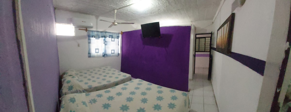 We are located half a block from the beach in the Villa Obregon neighborhood in the Bay of Barra de Navidad–Melaque. A 2 minute walk to the beach front. Quiet , clean, private and safe environment. Full open screened kitchen with table and two chairs with garden views .WiFi , hot water. . Great place for a person traveling alone or a couple. Bedroom is adjacent to the kitchen, full size bed and bathroom inside bedroom. Private small patio outside the kitchen. Wall fans , well ventilated.