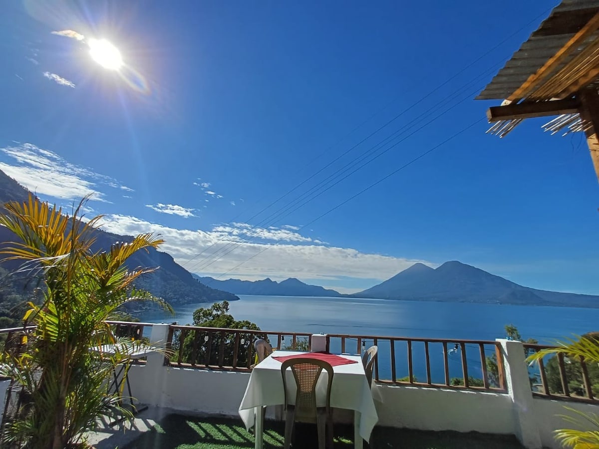 vista panorámica al lago desde la habitación con baño privado y agua caliente. este es un lugar de característica rural donde podrás apreciar hermosas vistas del lago, podrás ver 3 volcanes que rodean al pueblo de Santiago Atitlan y conectar con la naturaleza, y podrás disfrutar de área privada con acceso al lago.