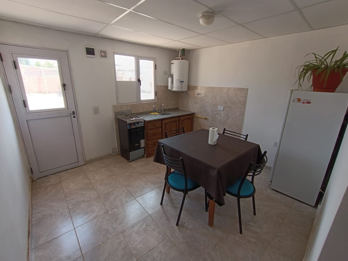 Beautiful minimalist apartment located in the heart of San Rafael, just 5 blocks from Km 0 of the city and 8 blocks from the terminal, right in the center. The apartment has high-speed WiFi, air conditioning, heating, 42" 4k Smart TV with Netflix, HBOmax, Star+, Dinsey+ and Prime account, fully equipped kitchen, refrigerator, microwave, toaster, electric juicer and electric kettle, double bed and linen service, work office and patio with grill.