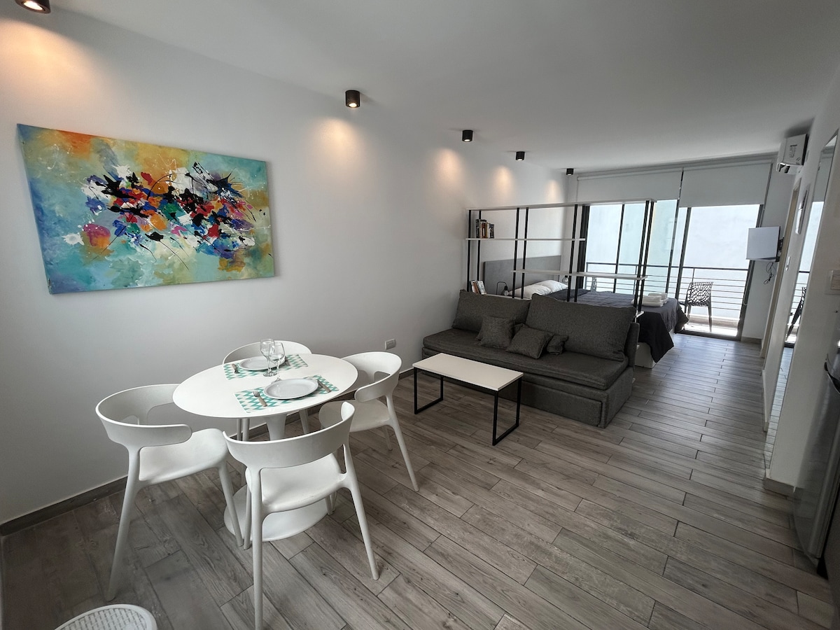Experience Puerto Madero, one of the most exclusive areas of Buenos Aires. This modern studio is perfect for couples or solo travelers, with a comfortable bed, equipped kitchen, full bathroom, and air conditioning. Enjoy the balcony overlooking the complex's pools. With Wi-Fi and a privileged location, you'll be close to the Ecological Reserve, the Women's Bridge, and a variety of restaurants and attractions. An elegant, quiet, and central space in the heart of the city.