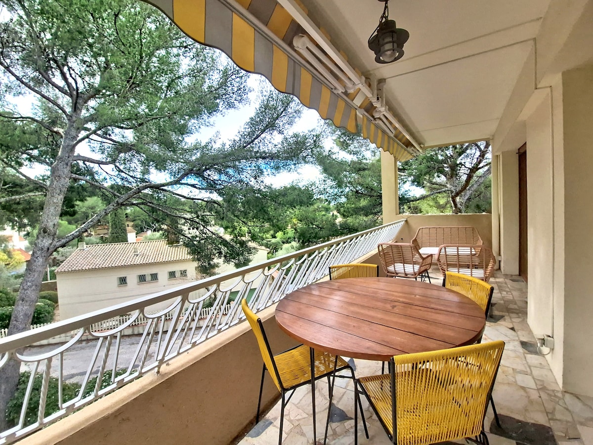 40 m2 studio completely refurbished (2023), air-conditioned and very well equipped, south-facing, very bright, with magnificent views of the sea, in a 14-hectare park of fenced pine forest and guarded 24/7. The residence is equipped with a 25 m swimming pool, 3 tennis courts, a private port, and access to a pebble beach. Numerous walks on the coastal path with a succession of coves, 20 minutes' walk from the center of Bandol (all shops and activities), 5 minutes by car or shuttle.