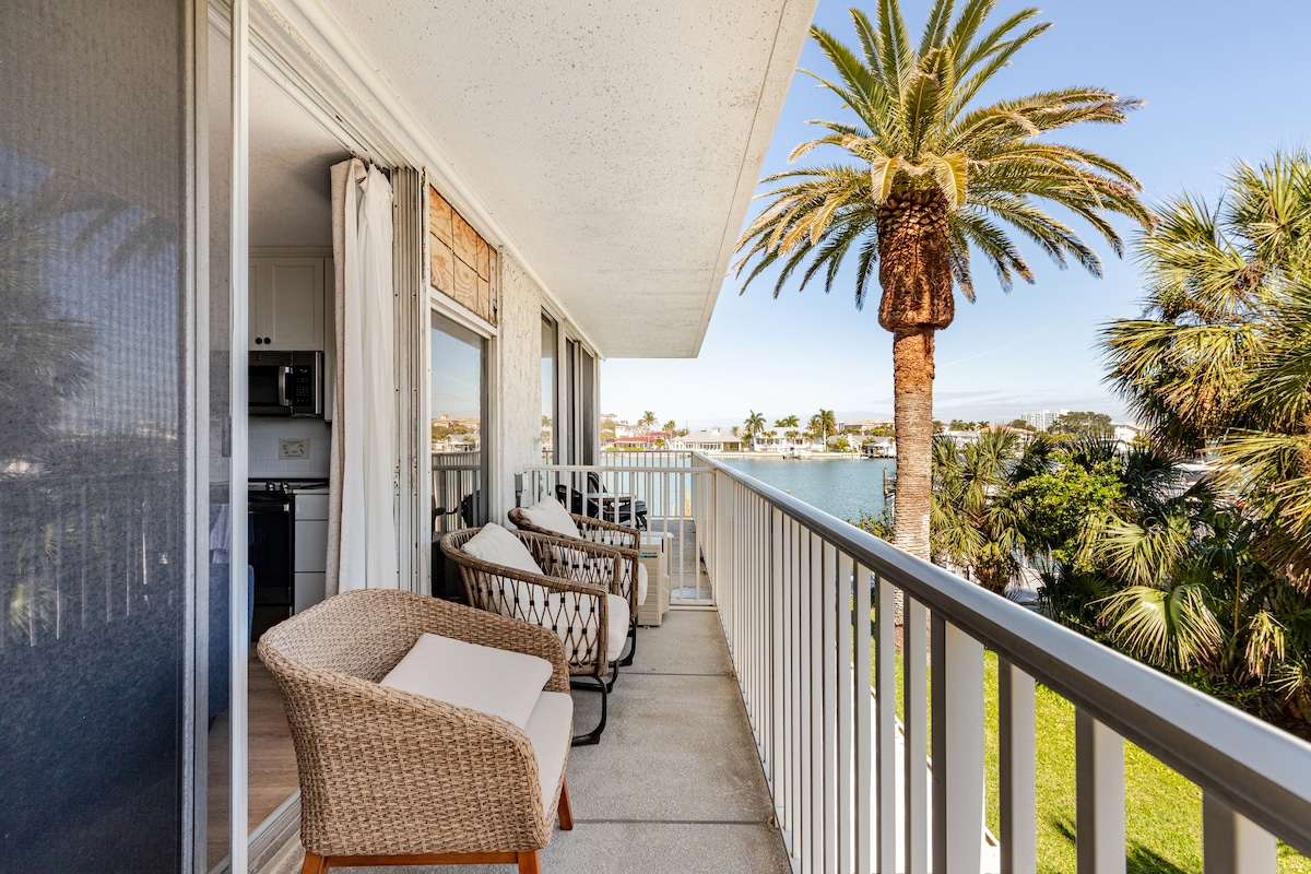 Pristine villa in the lovely seaside Gulf town of Indian Rocks Beach, 2 short blocks to the beach & the Intracoastal in your backyard. All newly renovated, both inside and out, enjoy unobstructed water views, private entrance, personal patio & your own indoor/outdoor fireplace. When you aren't lounging outside or taking a glide on our paddle board, you'll love the gourmet kitchen, comfy living room, two large TV's, cable/wifi, luxe memory foam king bed & secured safe.