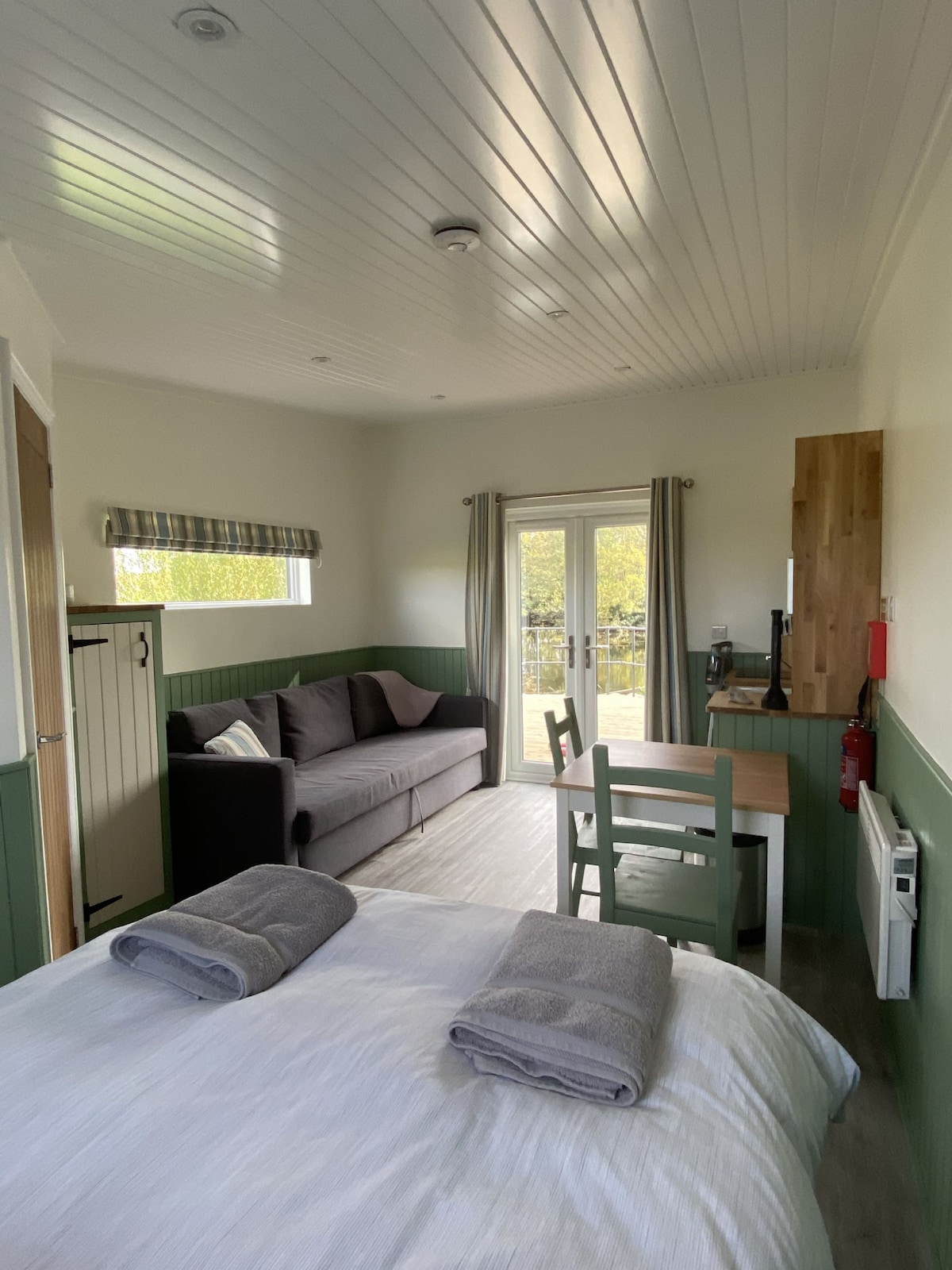 The Lily Pod is a self-contained holiday pod situated at our pond here at Lochhill Farm. It can sleep up to 4 people but more suited to two. The Pod has an open plan bedroom, living, dining and mini kitchen area and an enclosed shower room. Outside we have an open decking looking on to The Pond and stunning views further towards Criffel.