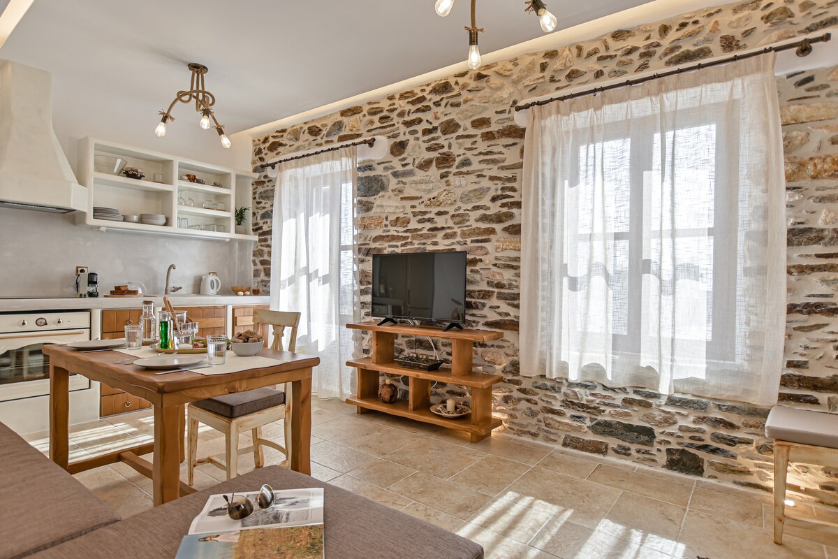 Kambones 1615 is a lovingly restored historic home which has been in our family for centuries. Our Venetian ancestor Michel Sanudo married into our family in the year 1615, giving the house its current form, with the balcony doors overlooking a valley with ancient olive groves . The old furniture has been restored and every beautiful feature has been preserved. The thick stone walls make it cool in summer and warm off season . We are certified by Ecotourism Greece .