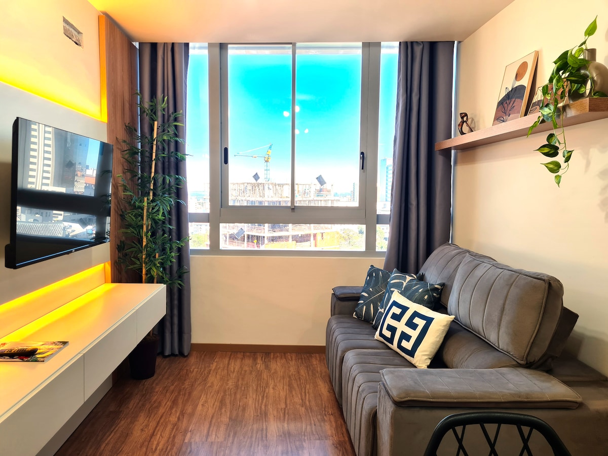 Enjoy a unique experience at this centrally-located place. This cozy loft in the city center is perfect for those looking for style, comfort, and an amazing view of the sunset and the city. With an industrial design and subtle lighting that seeks functionality and warmth, the environment mixes materials and colors that create a unique atmosphere full of personality. Located in the city center and on the 13th floor, it is an ideal environment for those who want to experience the city with a lot of charm and comfort.