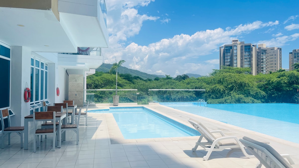 Experience the Caribbean in a unique building in Santa Marta's Historic Center, one block from the sea and surrounded by the best cultural and gastronomic offerings. Enjoy rooftop pools with 360° views of the ocean and the Sierra and a shaded pool on the first floor. Design that combines modernity and historical charm. The apartment offers 2 air-conditioned bedrooms, a living room with a sofa bed, an equipped kitchen, private balconies, and WiFi. All designed for an authentic and comfortable experience.