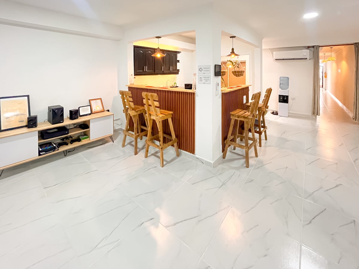 Take the family to this fantastic place 3 to 4 blocks from Playa de el Puerto located in Rodadero Sur, close to shops: Rapimercar and Olimpica, C.C. Arrecife. 10 blocks to the center of Rodadero. It is attached to the family home but completely independent. It has all the services included to meet all needs, making the atmosphere cozy. We will be happy to help with whatever you need 24/7. Newly remodeled. Pets are welcome