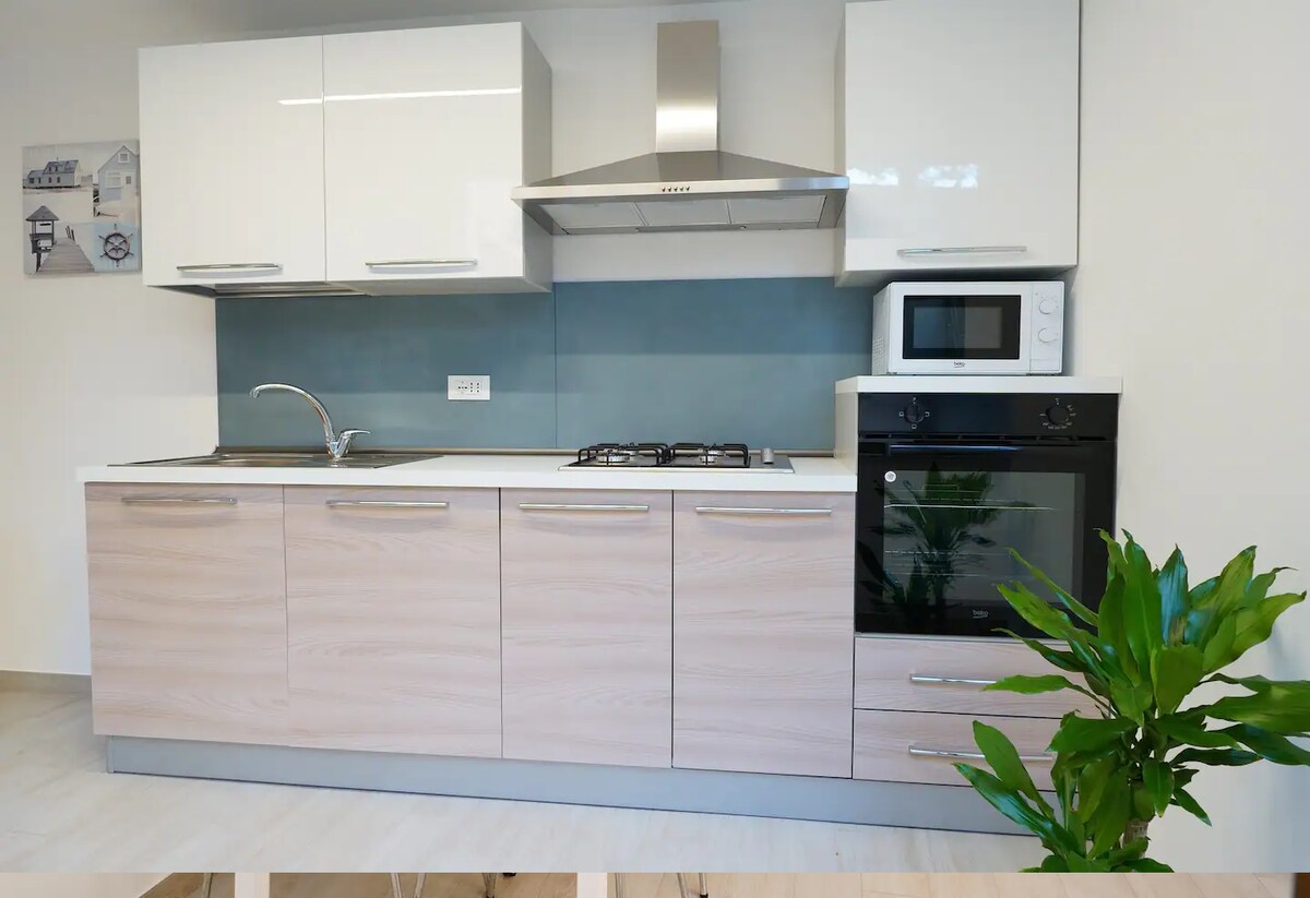 Elegant apartment on the Stazzo seafront, consisting of a large living room, two bedrooms, two bathrooms and a kitchen. The house, which has undergone a major renovation, is inspired by a joyful, light and bright style. The contemporary-style decor is characterized by light and fresh colors and tone-on-tone hues.