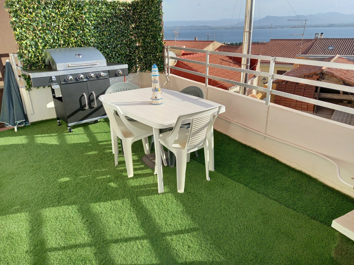 Lovely attic with panoramic views less than a 10-minute drive from the beaches of the island of Sant'Antioco. You will find an open space with a fully equipped kitchen and a living room with a TV and sofa. From the terrace you can enjoy the beautiful view of the lagoon. The bedroom is equipped with a high-quality mattress and pillows. The bathroom has an elegant mosaic shower. We are located on the top of the hill of Sant'Antioco (700 meters from the center), we recommend the use of the car because the road is steep.