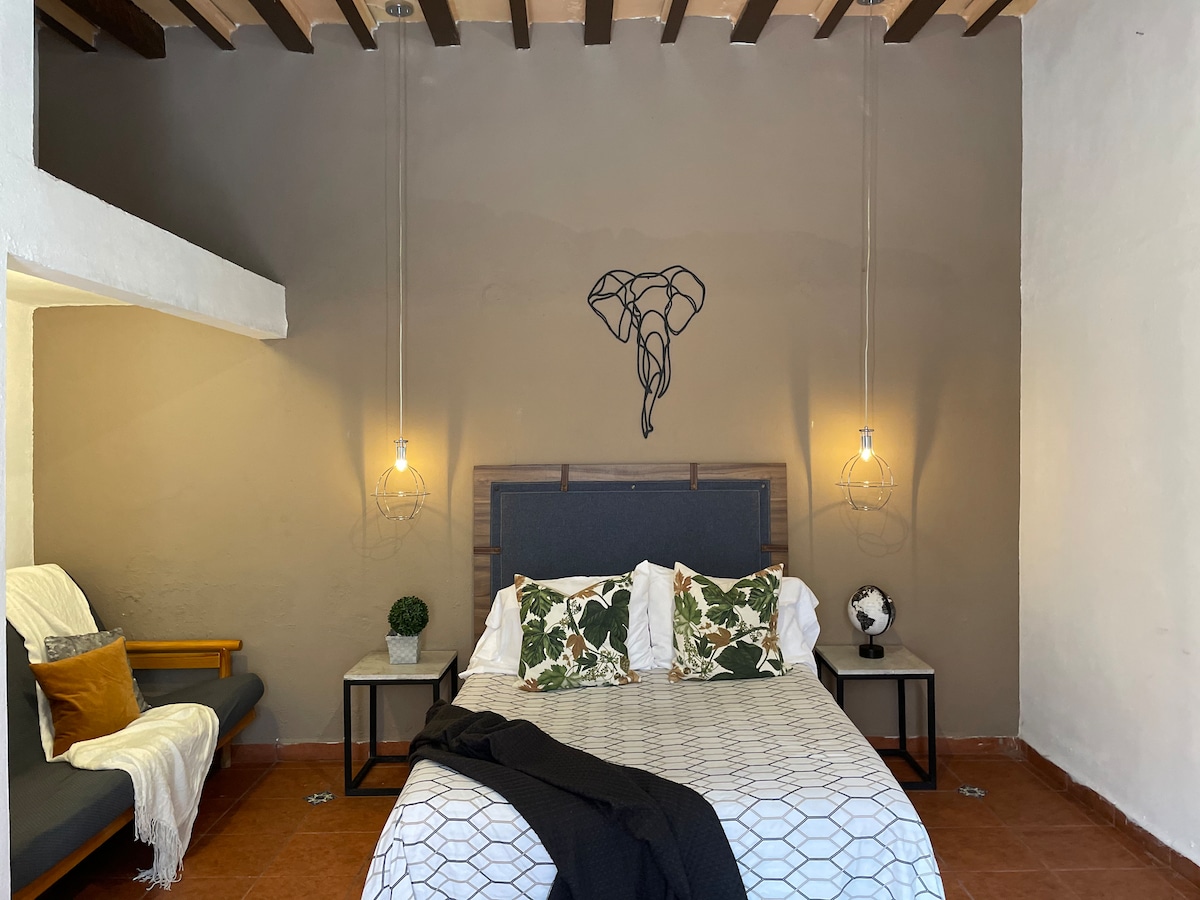 Enjoy a stylish experience at this cozy studio apartment in the heart of Querétaro City center. Perfect location if you are visiting the city. Walking around the area you can find restaurants, bars, cafes, museums, stores and much more. The apartment has a fully equipped kitchen, spacious full bathroom, cozy bedroom with TV, AC, closet and a working space. It also has a shared entrance, small shared patio with an outdoor dining table, and a lot of plants to make you feel at home.