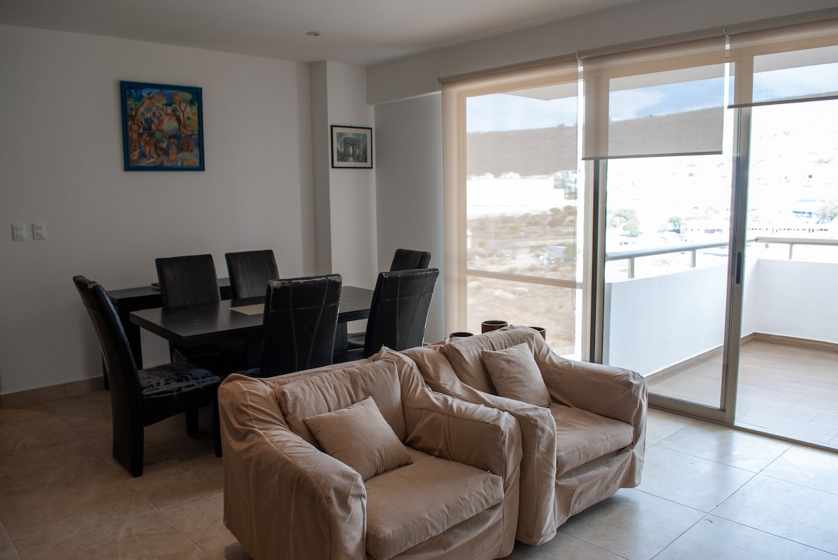Biosphere Towers, Juriquilla Modern apartment with 2 bedrooms, 2 bathrooms and an equipped kitchen. Includes internet and Smart TVs, comfortable sofa bed in the living room. Family Amenities: Pool, Playroom, paddle tennis court and Ping Pong. Adults Only Amenities: Jacuzzi, Swimming Lane, Gym, Sauna and Steam. Ideal for resting or working. Located near shopping centers and roads in Queretaro's best area.