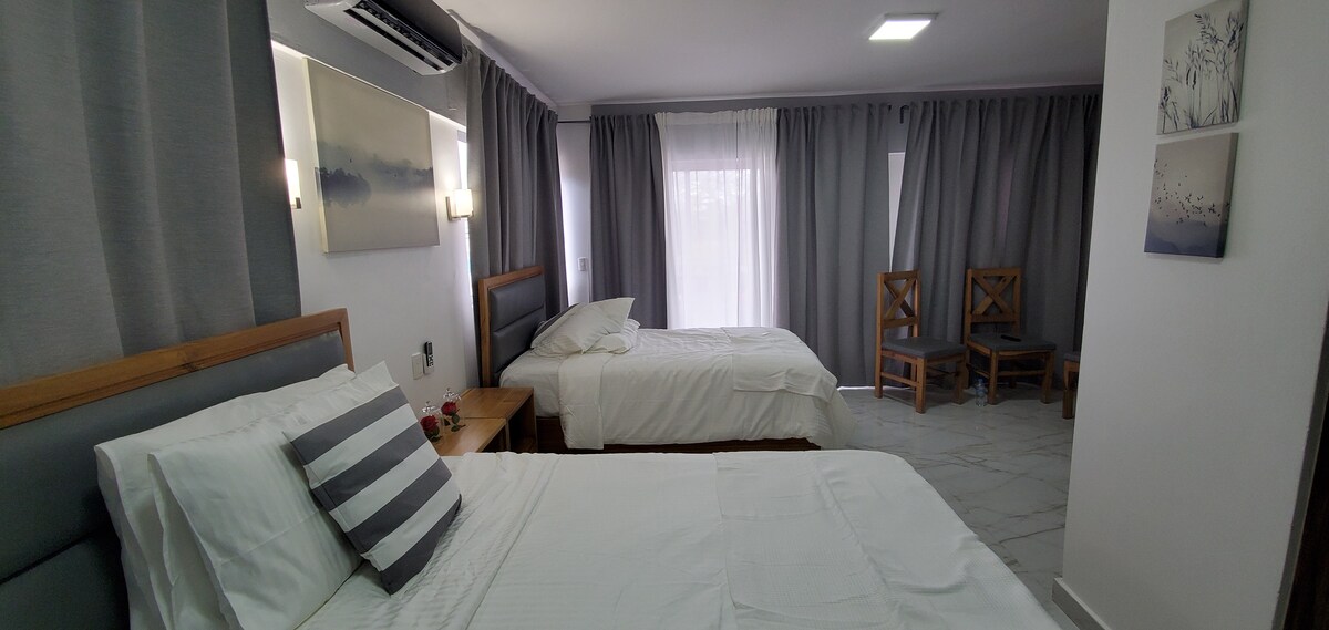 We offer a comfort, cleanliness, and safe experience, not just a home. It's within walking distance to Hard Rock Café Santo Domingo and Blue Mall (Cartier, Ferragamo, Carolina Herrera, Louis Vuitton, MontBlank etc.), Typical bars and Restaurants... In our Lobby you can find RECOMMENDATIONS for places to visit and activities of all kinds: colonial area, maps, bicycle area, tourist train, chocolate museum, shopping guide, etc. Only 35 minutes from SDQ airport. We recommend reliable transportation to/from SDQ with reservation. Just 5 minutes from the Mall. 15 minutes to Colonial Zone. Easy access and check-in. Attention to detail. Concierge available to assist you. Equipped with King bed, BlackOut curtains, KITCHEN, Air conditioning, Smart TV, Free Netflix, Wifi, Rooms, Desks, Alternative Electricity, Hot Water, Bathrooms with Shower and Jacuzzi. And, best of all, there's complimentary breakfast included, every day from 8:00 a.m. to 10:00 a.m., which will make you feel at home! A permanent coffee and water station. Common areas include: Reception, Rooms, Dining Terrace, Permanent Coffee and Water Station, Visiting Bathroom, Parking. Our guests say: "This is an amazing, very clean and comfortable place. We recommend it 100% for anyone looking for a great place to be close to everything" (Gisell, May 2018). "Too much for just one heart," said Aileen and her husband, guests who visited us in April 2018. Spacious, comfortable and fully equipped room for Guests. Super comfortable king-size bed, designed for the well-being of its occupants. Internal bathroom with jacuzzi and shower. White linens and towels. We offer a permanent coffee and water station, all day. Also breakfast of rolls, cereals, cheese, milk, biscuits, muffins, cookies, toast, fruits or yogurt and juice. Included in price. Common areas: Reception, Room, Dining Terrace, Permanent Coffee and Water Station, Visiting Bathroom, Parking. We're here to help you 24/7 Centric, Tranquil and Quiet. Walking distance to various Supermarkets, Pharmacy, Restaurants, Bars, Commercial Square, Gym, Veterinary, Stationery, Beauty Salon. Close to Metro Routes and Public Transportation. Easily accessible by car. Uber available and you can walk anywhere. Great view and climate.