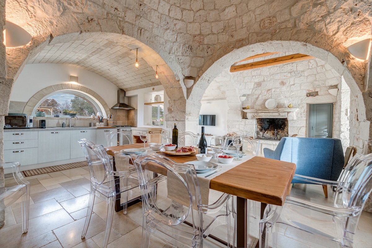 Nunc is an authentic 5-trullo dwelling. Two spacious bedrooms, one of which is a king size with two windows, two large bathrooms with a window and a comfortable shower with a shower head, one of which has chromotherapy, a kitchen equipped with all comforts. A beautiful patio with a kitchen equipped with a wood-burning oven overlooks the small heated pool with a whirlpool, built in the ancient stone farmyard. A Turkish bath in a small trullo for pleasant moments of relaxation, for private wellness.